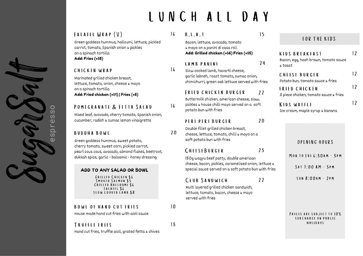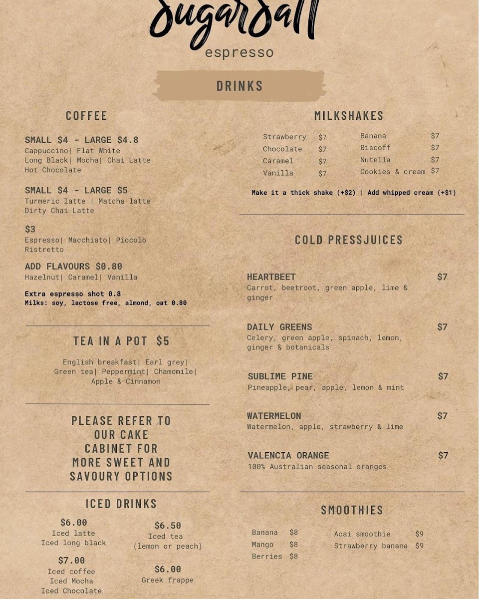 Welcome to SugarSalt Espresso - Mortdale, a delightful cafe nestled at 34 Pitt St. This gem is an ideal spot for breakfast lovers, offering a tempting all-day menu that highlights quality ingredients and well-crafted dishes. Indulge in their Eggs on Toast or savor the robust flavors of a Bacon & Egg Roll on a fresh panini. For those seeking something heartier, the Breakfast Wrap with its comforting mix of bacon, eggs, and fresh veggies is a must-try.